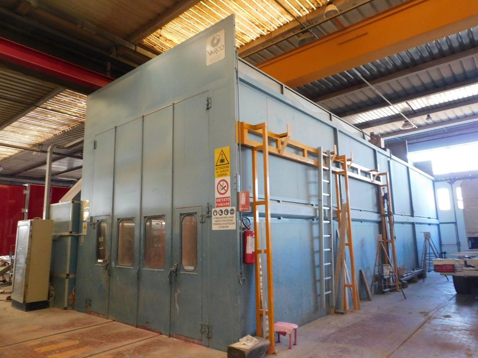 n. 1 kabinë/oxhak pikturimi VARCO, Mod. 1100+500x500x470, matr. 960901, gjatësi 18 metra, viti 1996, e markuar CE, e pajisur me dy platforma ajri lëvizëse mbi shina, n. 1 pompë pikturimi, panel komandimi, dy aspiratorë/filtra me shkëmbyes për ngrohje, n. 3 filtra ekstraktimi - rif. 208