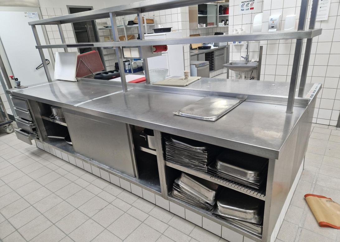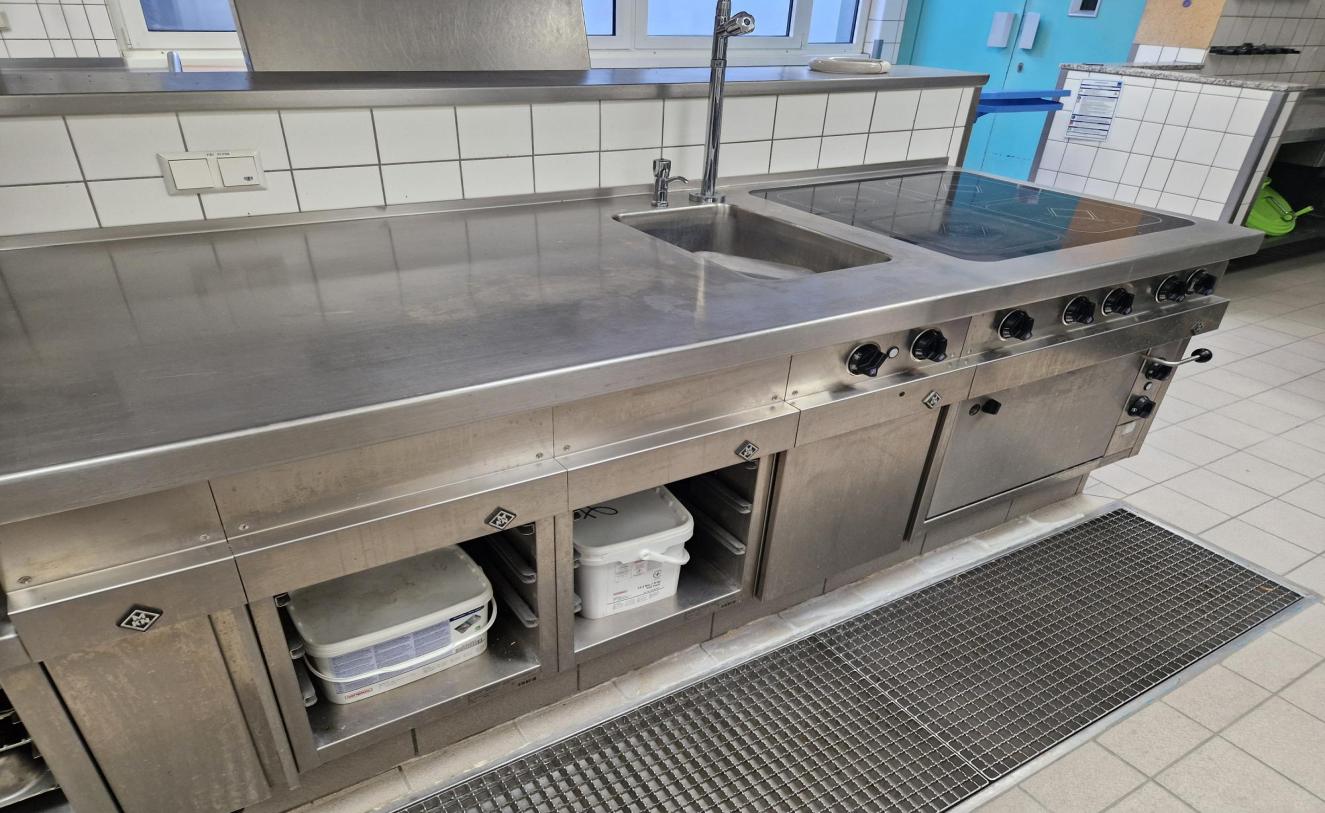 Arbetsbänk komplett med handfat med 1 skål, induktionshäll med 4 plattor, ugn och synlig kastrullhållare, mått 220x84x90h