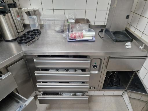 köksskåp med handfat, 2 stora lådor, 5 lådor för kastruller, 4 lådor för glas, strukturerad som en enhet i en obtus vinkel, mått: